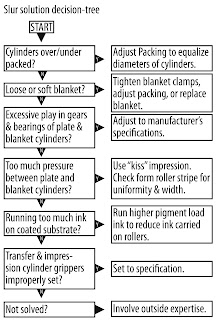 Printing presses whether they're an older manual model (like the one pictured) or a modern computerized system, share one purpose in common - they must be able to lay down a film of ink with remarkable precision and consistency.For a typical offset press, one ink tower delivering one of the four primary colors in full color printing lays down an image covering an area approximately 40" x 28". That image is formed by splitting a film of ink 4 microns thick (a tenth the thickness of a human hair) twice (plate to blanket then blanket to paper), while at the same time emulsifying it in a chemical solution (made primarily of water) to a depth of a few molecules. Too much water and the ink washes away. Not enough water and ink starts to print in the background. The ink is carried by approximately 19,250,000 halftone dots averaging in size from 10 to 60 microns. The final film of ink deposited on paper over the whole 1,120 square inch area of the image and is held to a thickness of about 1 micron (one fortieth the thickness of a human hair) with a tolerance of +/- one-tenth of a micron. The positional accuracy of the image is held within one-three hundredths of an inch - about 40 microns. All in one quarter of a second on press.